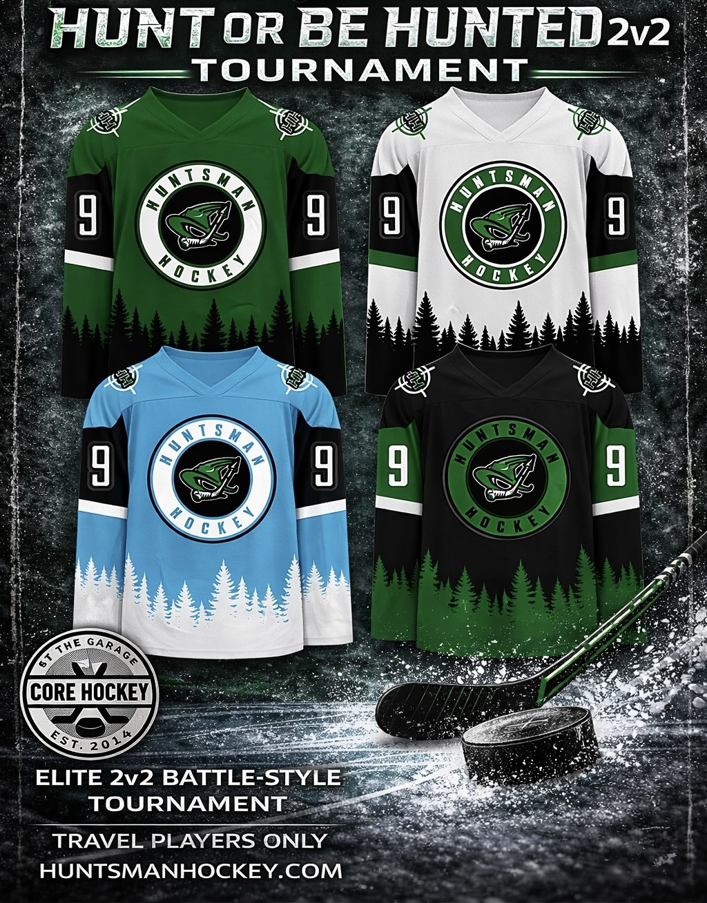 We will be supplying all of our registered players with CUSTOM never before seen Huntsman Hockey Jerseys! Our teams will face off in a 4-game guaranteed round-robin style tournament with the winner taking home the HUNTSMAN CUP!